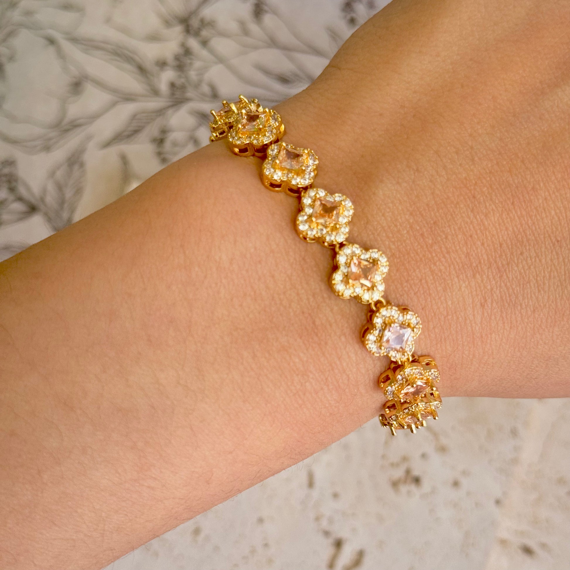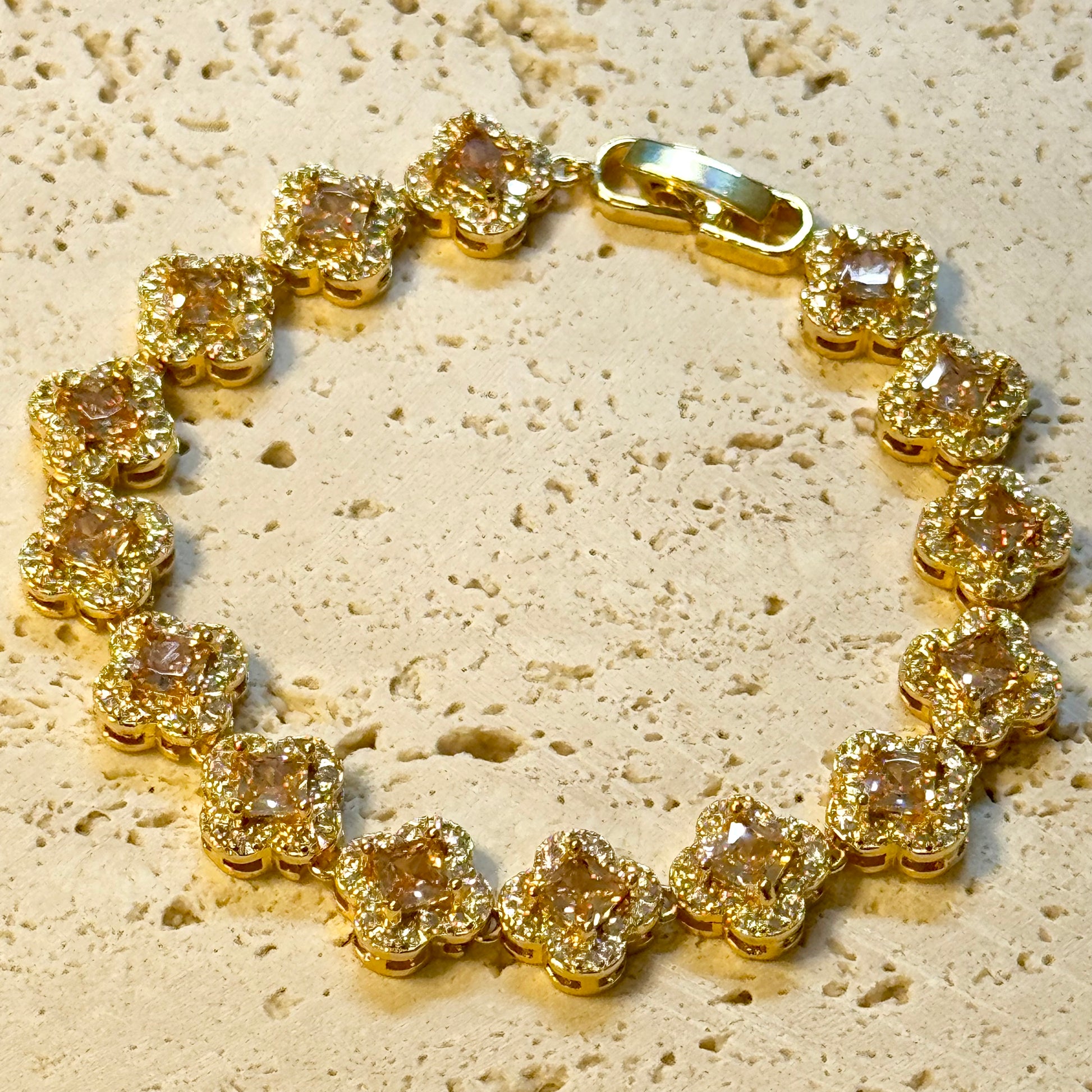 GLANZI Vierblättriges Kleeblatt Armband – 18K vergoldetes Kupfer, Champagner-Zirkonia, 18 cm