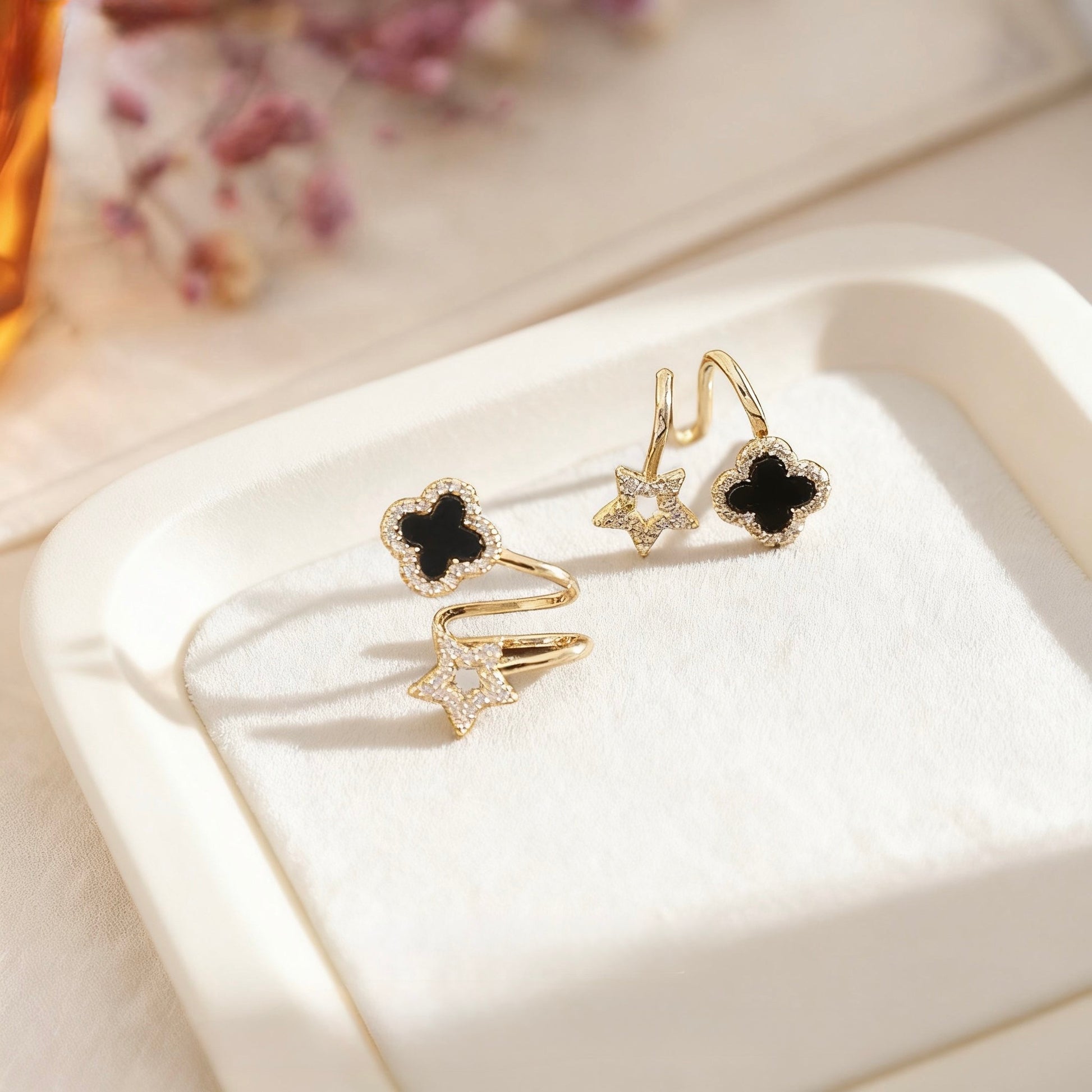 Diese edlen Ohrstecker kombinieren zwei starke Symbole: das schwarze vierblättrige Kleeblatt 🍀 als Glücksbringer und den Stern ⭐ als Zeichen von Hoffnung & Strahlkraft. Veredelt mit funkelnden Zirkonia-Steinen und gefertigt aus Kupfer mit 14K Echtvergoldung, bieten sie zeitlosen Glanz und hohen Tragekomfort dank S925 Silberstecker.