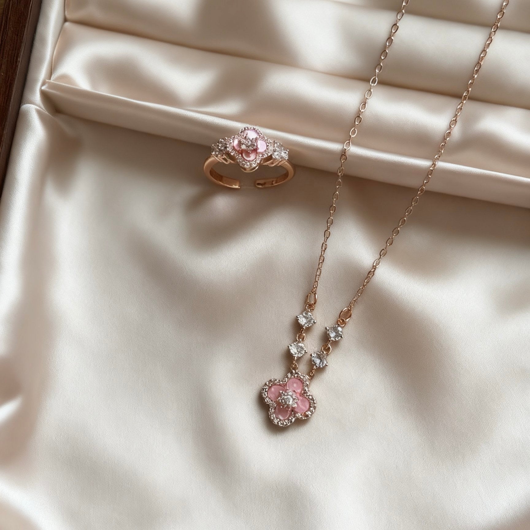 Vierblättriges Kleeblatt Schmuck-Set – Halskette & Offener Ring mit Zirkonia in Rosa